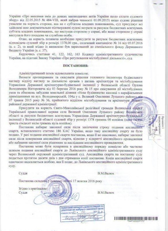 Суддя Волинського адміністративного суду виніс рішення на користь позивача, громади УПЦ села Великий Омеляник, ще 12 жовтня 2016 року. Однак певний час набуття ним законної чинності переносилось, оскільки відповідач подав на апеляційний розгляд. Втім, за цей період у ДАБІ не віднайшли можливості сплатити судовий збір. Відтак у розгляді справи їй відмовили, та громада УПЦ врешті повернула собі можливість законно будувати свій новий храм на своїй ділянці у селі Великий Омеляник – фактично вона входить до території одного з луцьких дворів, що розташовані на межі села та обласного центру.