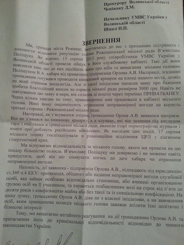 Як це повідомляє Народна самооборона Рожище у Фейсбуці, під зверненням до прокурора області та начальника міліції на підтримку мера за 2 години поставили свої підписи 450 рожищан.
