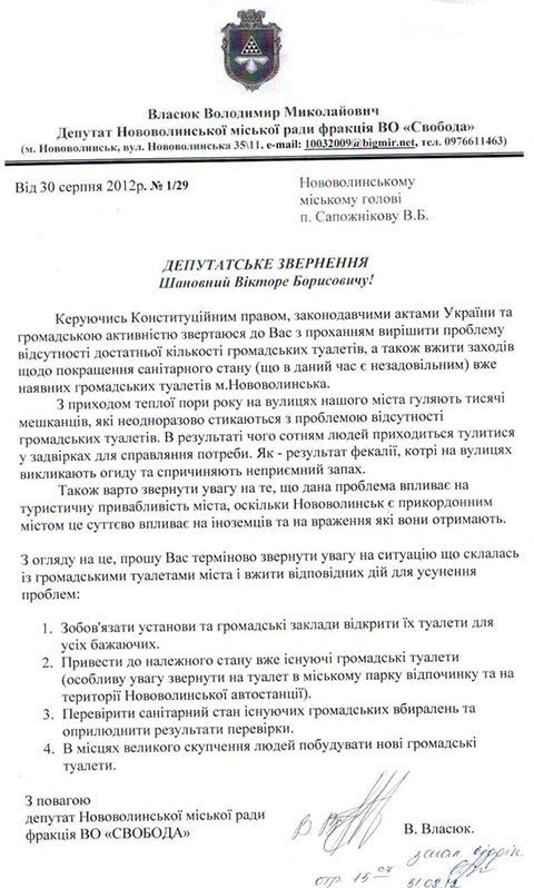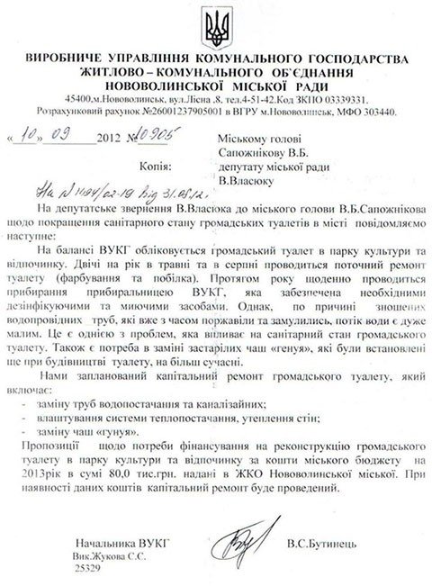 Депутат Володимир Власюк 30 серня 2012 року написав депутатське звернення до міського голови Віктора Сапожнікова. Отже, 80 000 гривень— і капітальний ремонт клозету в парку (зі слів начальника ВУКГ) було б зроблено. У туалеті врешті була б вода, щоб помитись, нова каналізація, підвели б теплопостачання і навіть утеплили б стіни.