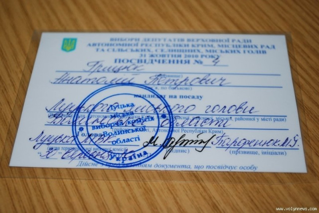 Своє «кандидатське» Грицюк отримав 30 вересня з рук голови Луцької міської територіальної виборчої комісії Марії Парфенюк.