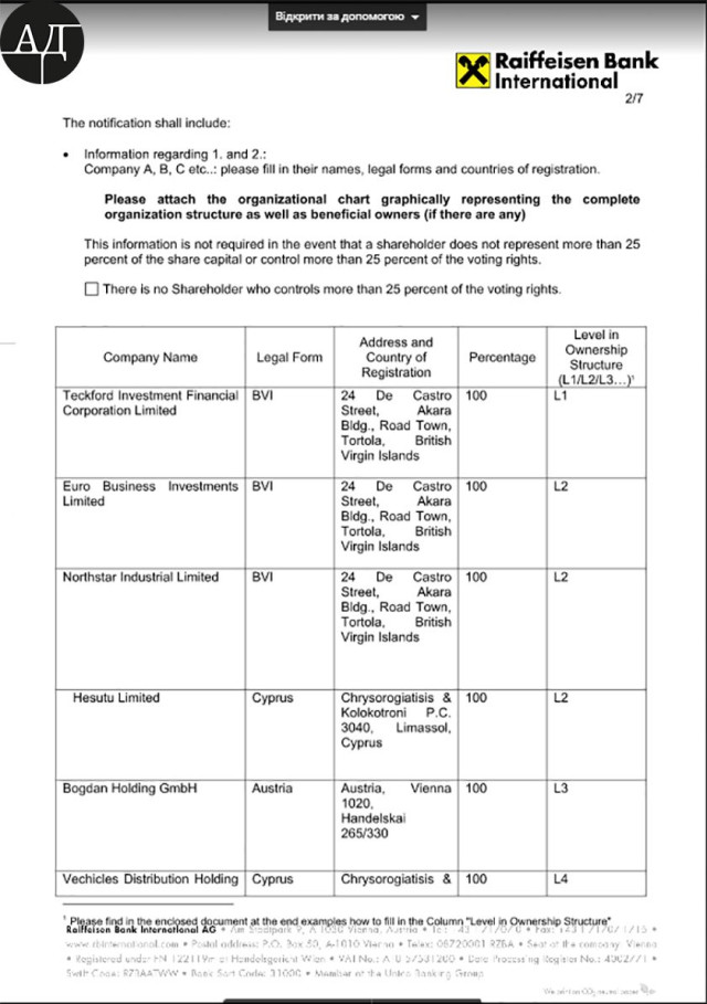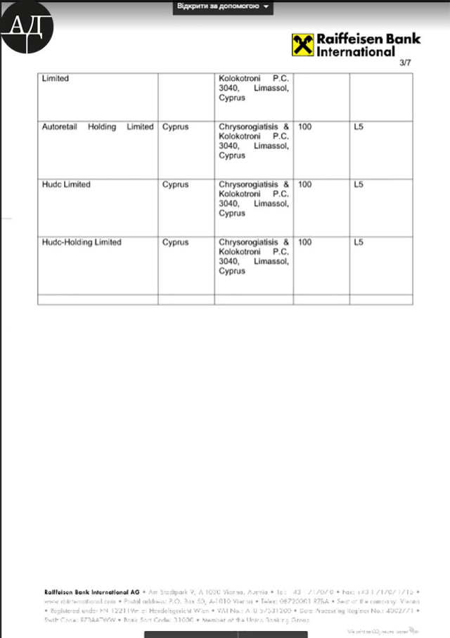 Лист офшорній компанії Гладковського банку Raiffeisen:
