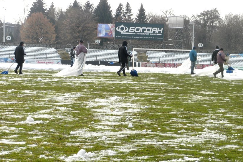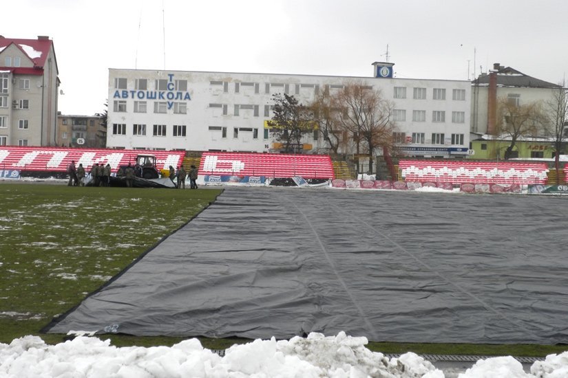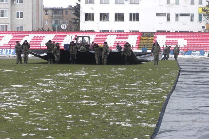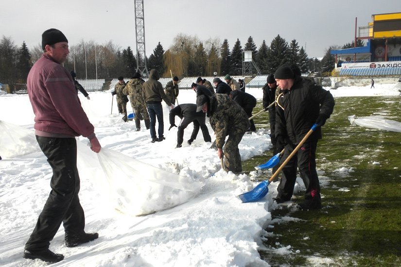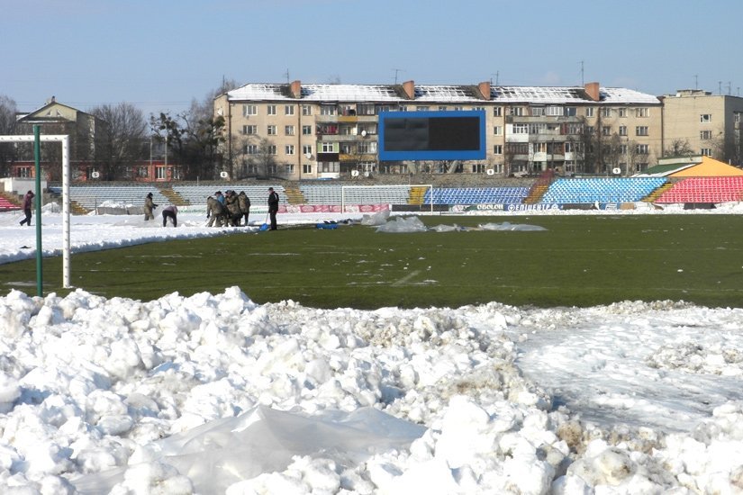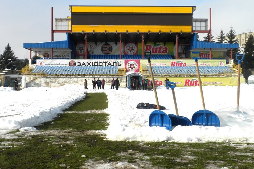 Працівники стадіону й ФК «Волинь» і навіть найпалкіші вболівальники команди (за це їм окрема шана й повага) прибирали сніг із газону. Відзначимо, що цього року опадів взимку було більше тогорічного показника, відтак готувати стадіон до відновлення чемпіонату нелегко.