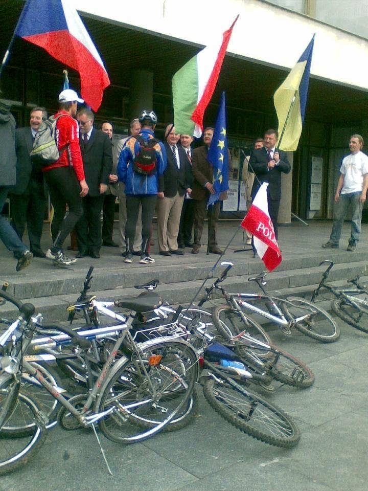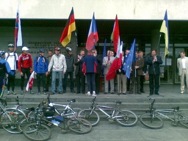 Пізніше посли країн Євросоюзу (Німеччини, Чехії, Польщі, Угорщини) передали велосипедистам державні прапори.