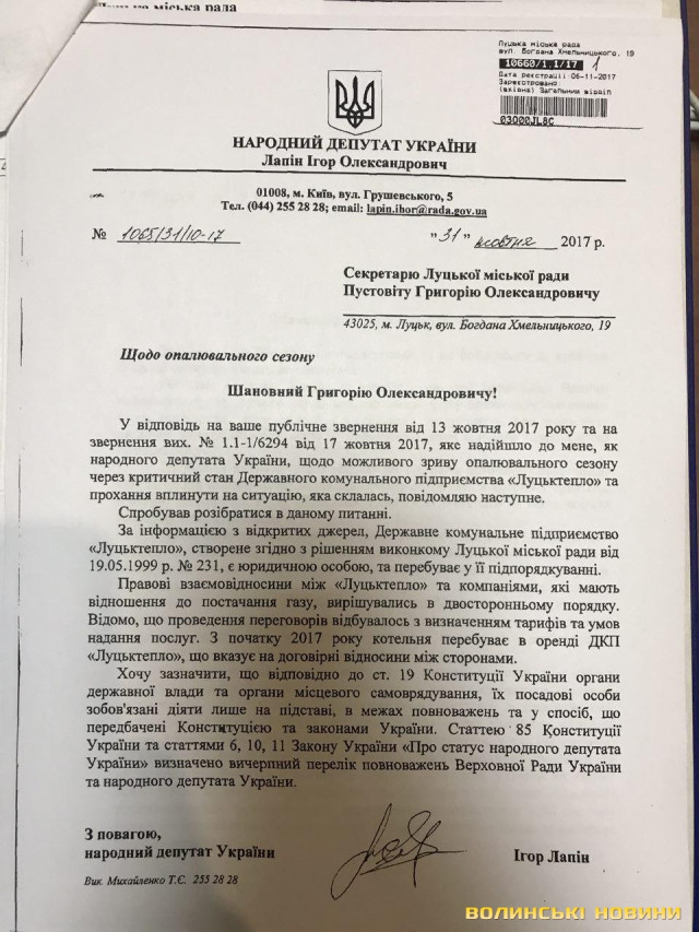У відповідь на звернення на адресу Луцькради прийшла звичайнісінька «відписка», датована 31 жовтня, в якій вказано, що Ігор Лапін «спробував розібратися в даному питанні». Але схоже на те, що нардепу все ж таки розібрати і не вдалося.