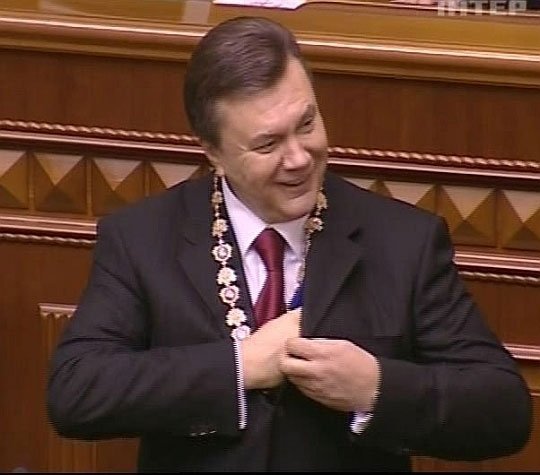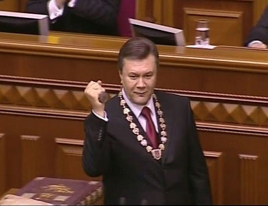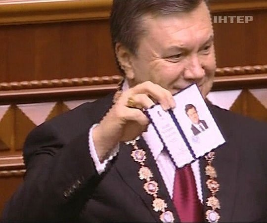 Прочитавши присягу, передану головою КС, Янукович її підписав. Потім йому передали символи влади. Видно Януковичу дуже сподобалась печатка. Він дуже довго демонстрував її залу, ніби вже передчуваючи, як буде нею карати і милувати.