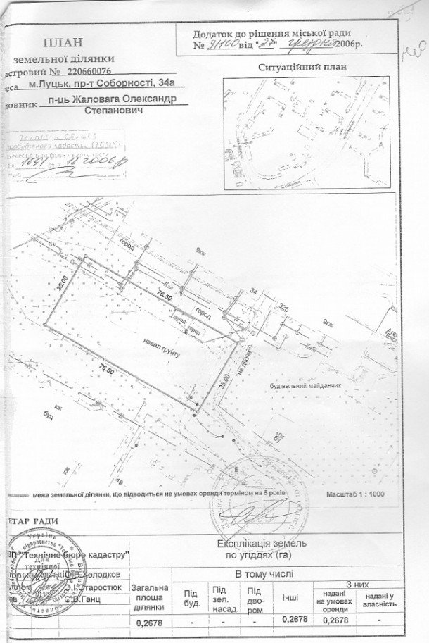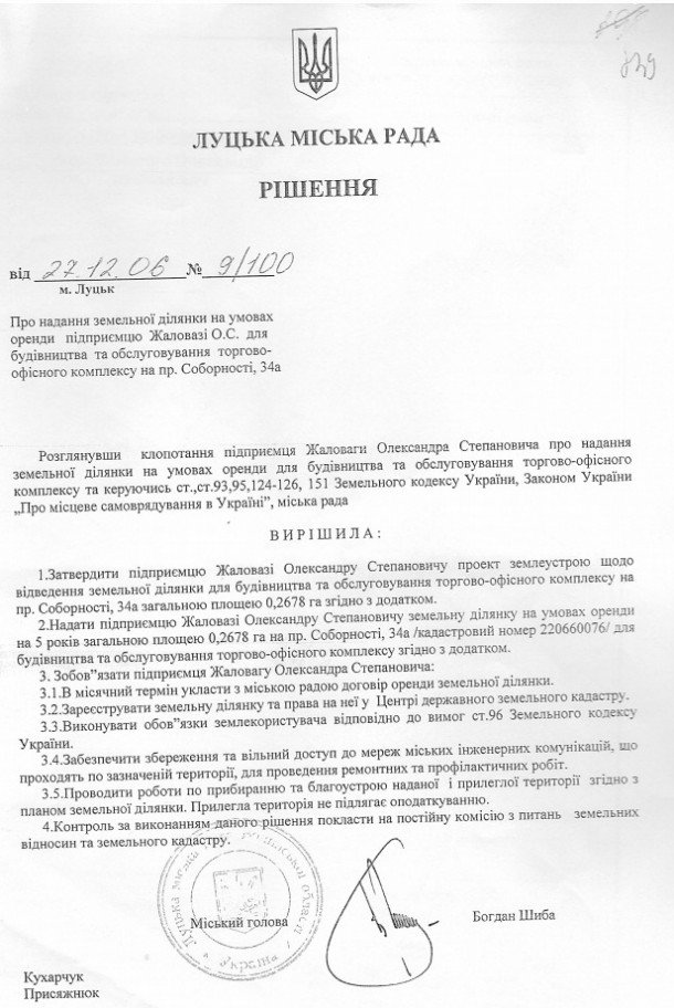 Одним із найбільш гучних корупційних діянь Сергія Григоренка стало привласення земельної ділянки 0,27 га для будівництва торгово-офісного центру на пр. Соборності, 34. 12 грудня 2006 року сесія міської ради надала дану ділянку для будівництва та обслуговування торгово-офісного комплексу Олександру Жаловазі. Однак, окреслений проект так і не був реалізований, а власник згодом продав ділянку "Луцькій будівельній компанії", якій уже 5 лютого міськрада дозволила зробити автостоянку на цьому місці.