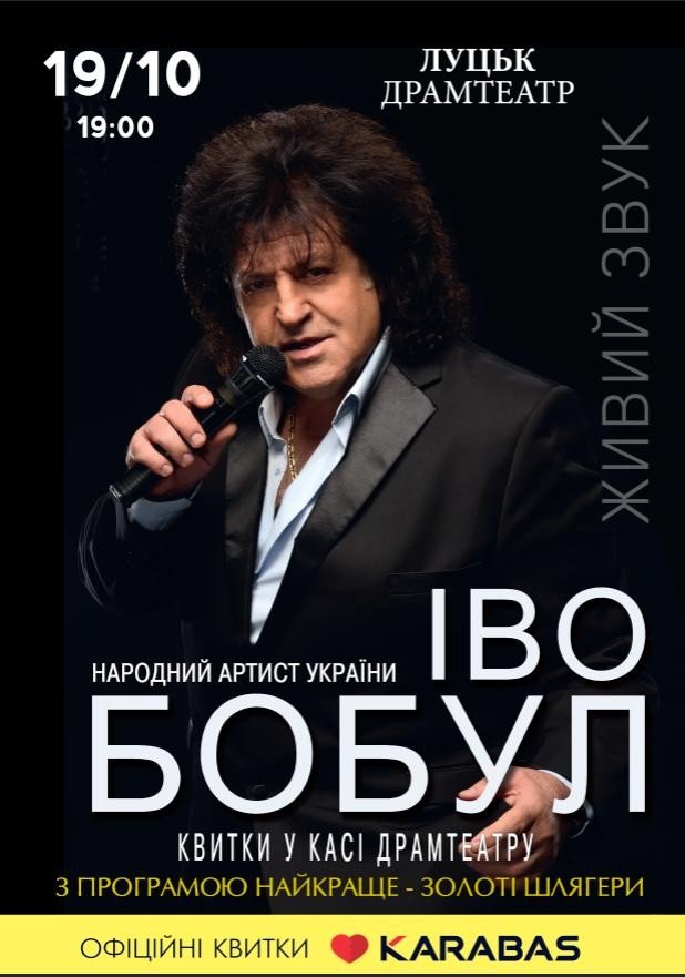 Квитки на концерт у Луцьку можна придбати в касі облмуздрамтеатру, а також онлайн: https://lutsk.karabas.com/ivo-bobul-8/order/