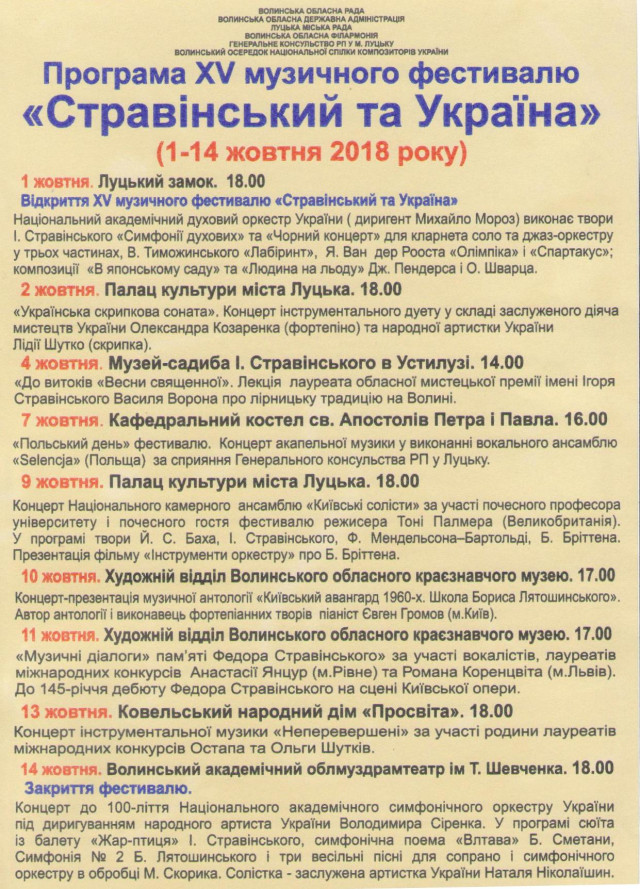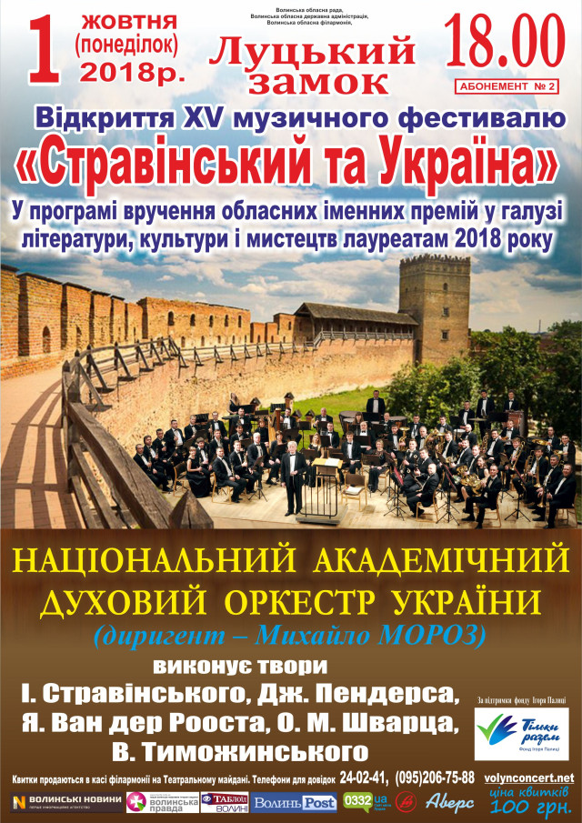 Національний академічний духовий оркестр України (диригент Михайло Мороз) виконає твори Ігоря Стравінського, Дірка Броссе, Джефа Пендерса, Феррера Феррана, Франко Чезаріні, Яна Ван Дер Рооста, Самуеля Хазо, Роберта В. Сміта, Отто М. Шварца.2 жовтня. Палац культури міста Луцька. 18.00