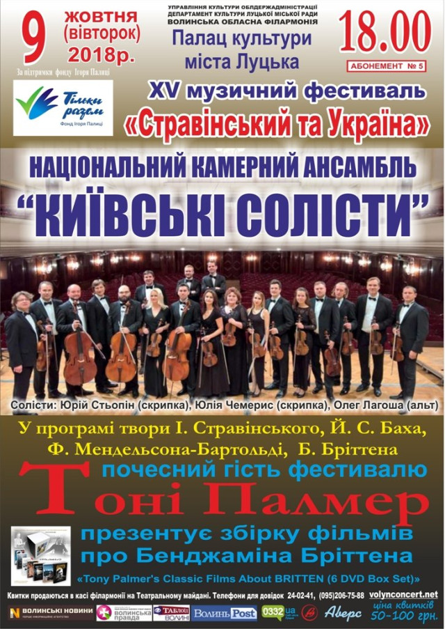 Концерт Національного камерного ансамблю «Київські солісти» за участі почесного професора університету і почесного гостя фестивалю режисера Тоні Палмера (Великобританія). У програмі твори Й. С. Баха, І. Стравінського, Ф. Мендельсона–Бартольді, Б. Бріттена.