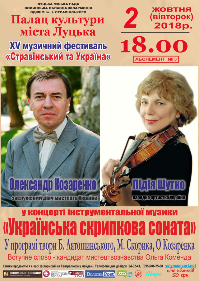 «Українська скрипкова соната». Концерт інструментального дуету у складі заслуженого діяча мистецтв України Олександра Козаренка (фортепіно) та народної артистки України Лідії Шутко (скрипка).4 жовтня. Музей-садиба І. Стравінського в Устилузі. 14.00