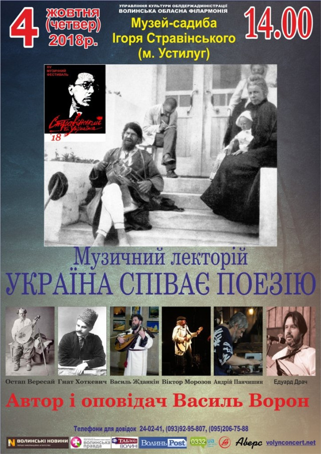 «До витоків «Весни священної». Лекція лауреата обласної мистецької премії імені Ігоря Стравінського Василя Ворона про лірницьку традицію на Волині.7 жовтня. Кафедральний костел св. Апостолів Петра і Павла. 16.00