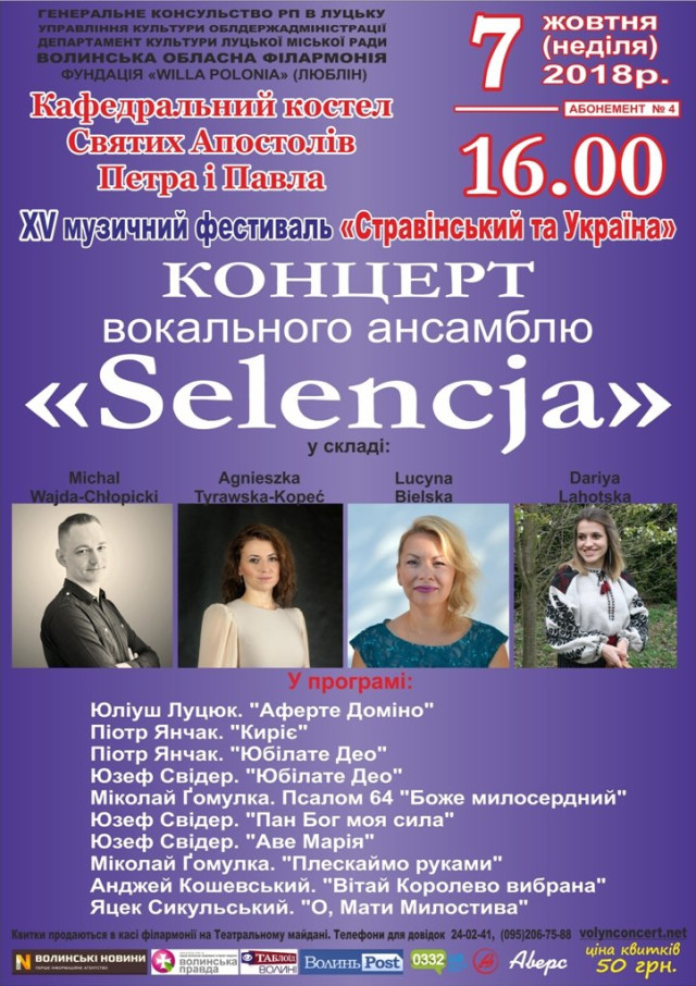 Концерт акапельної музики у виконанні вокального ансамблю «Selencja» (Польща) за сприяння Генерального консульства РП у Луцьку.9 жовтня. Палац культури міста Луцька. 18.00
