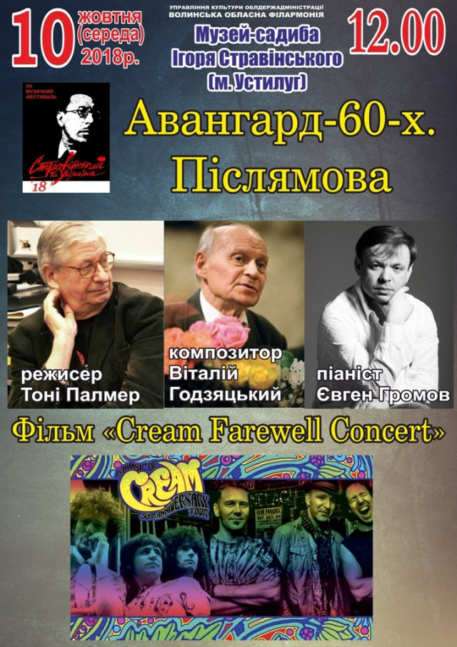 Концерт-презентація музичної антології «Київський авангард 1960-х. Школа Бориса Лятошинського». Автор антології і виконавець фортепіанних творів піаніст Євген Громов (м.Київ).11 жовтня. Художній відділ Волинського обласного краєзнавчого музею. 17.00