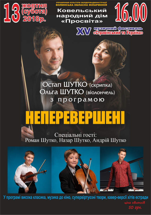 Концерт інструментальної музики «Неперевершені» за участі родини лауреатів міжнародних конкурсів Остапа та Ольги Шутків.14 жовтня. Волинський академічний облмуздрамтеатр ім Т. Шевченка. 18.00