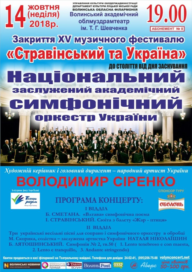 Концерт до 100-ліття Національного академічного симфонічного оркестру України під диригуванням народного артиста України Володимира Сіренка. У програмі сюїта із балету «Жар-птиця» І. Стравінського, симфонічна поема «Влтава» Б. Сметани, Симфонія № 2 Б. Лятошинського і три весільні пісні для сопрано і симфонічного оркестру в обробці М. Скорика. Солістка - заслужена артистка України Наталя Ніколаїшин.