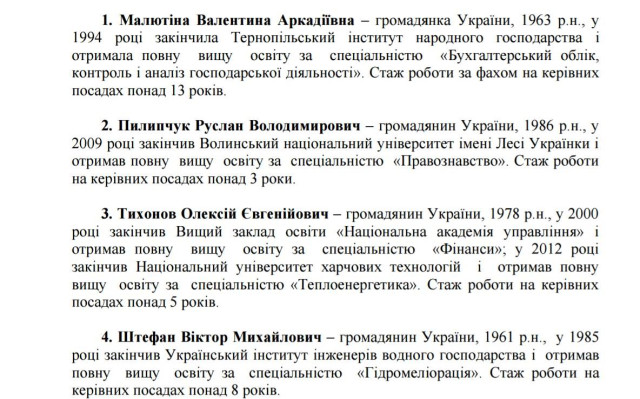 1. Малютіна Валентина Аркадіївна – громадянка України, 1963 року народження, у 1994 році закінчила Тернопільський інститут народного господарства і отримала повну вищу освіту за спеціальністю "Бухгалтерський облік, контроль і аналіз господарської діяльності". Стаж роботи за фахом на керівних посадах – понад 13 років.