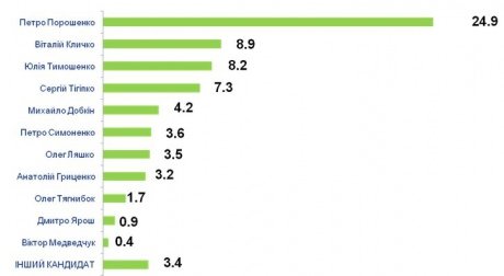 Серед тих, хто має намір прийти на вибори, перша п’ятірка виглядала би наступним чином: Порошенко – 36,2%, Кличко - 12,9%, Тимошенко – 12,0%, Тігіпко та Добкін - 10,0% та 5,3% відповідно.