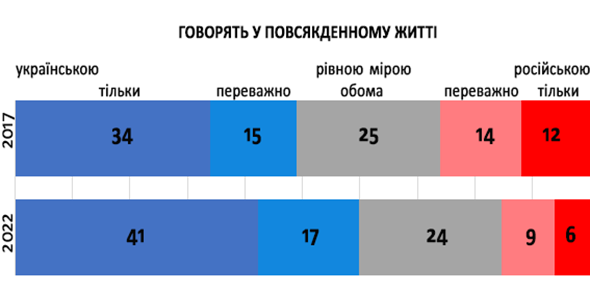 У кінці 2022 року, у порівнянні з 2017-м, кількість російськомовних українців зменшилася на 11%, а українськомовних – збільшилася на 8%.
