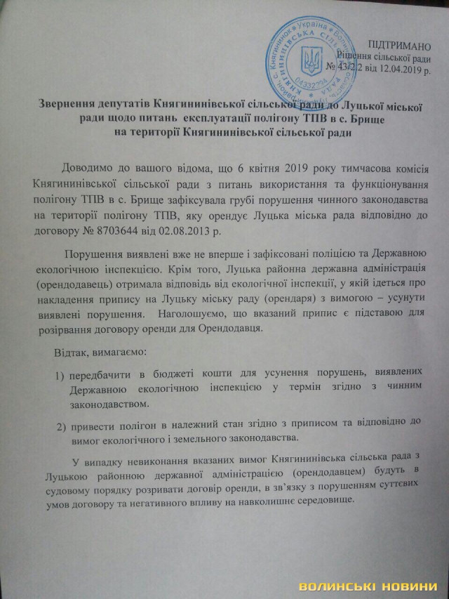 У протилежному випадку Княгининівська сільрада з Луцькою райдержадміністрацією погрожує в судовому порядку розірвати договір із Луцькою міськрадою щодо оренди останньою полігону в Брищі.