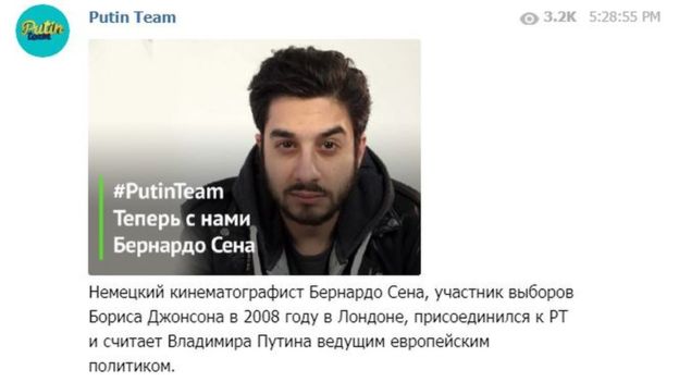 "Німецький кінематографіст Бернардо Сена, учасник виборів Бориса Джонсона в 2008 році в Лондоні, приєднався до РТ і вважає Володимира Путіна провідним європейським політиком" - так представили 34-річного Бернардо в соцмережах руху.