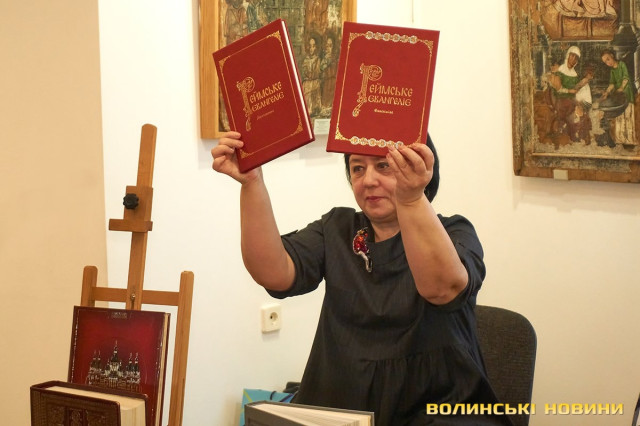 Одним з ініціаторів наукових досліджень та видання Євангелій став настоятель храму Св. Параскеви у селі Ратнів отець Онуфрій. Саме він відшукав вірогідне місцезнаходження першої книги – Луцького Євангелія, яке було у Москві.Друга книга – Луцький Псалтир – також побачила світ завдяки науковим розвідкам отця Онуфрія. Він встановив, що рукопис зберігається аж у Флоренції – в бібліотеці Лоренцо Медічі, яка вважається однією з найбагатших у Європі. Рік листування з тамтешнім керівництвом не минув марно. Італійці таки відшукали книгу, і наша делегація дістала нагоду працювати з нею.Далі була робота з Холмським Євангелієм, Лавришівським Євангелієм (за цю книгу довелося добряче посперечатися з науковцями Білорусі, які вимагали підтвердження її українського походження), Віденським Октоїхом. І нарешті у 2019 році світ побачила мрія Ганни Горобець – Реймське Євангеліє. Розкішне двотомне видання у футлярі є повною факсимільною копією, яка включає ще й дослідницькі матеріали.Присутні на заході священнослужителі, науковці, музейники, представники бібліотек високо оцінили подарунки. До того ж, дехто з них також отримав екземпляри Євангелій, аби передати до своїх книгозбірень. Ось так найкращі зразки нашої культури стають ближчими до людей. І приємно, що нині хай і не оригінали, але їх точні й надзвичайно якісні факсимільні копії доступні усім небайдужим українцям.Текст і фото – Олександр Дурманенко.