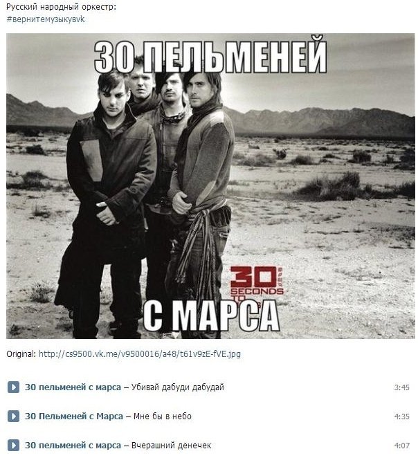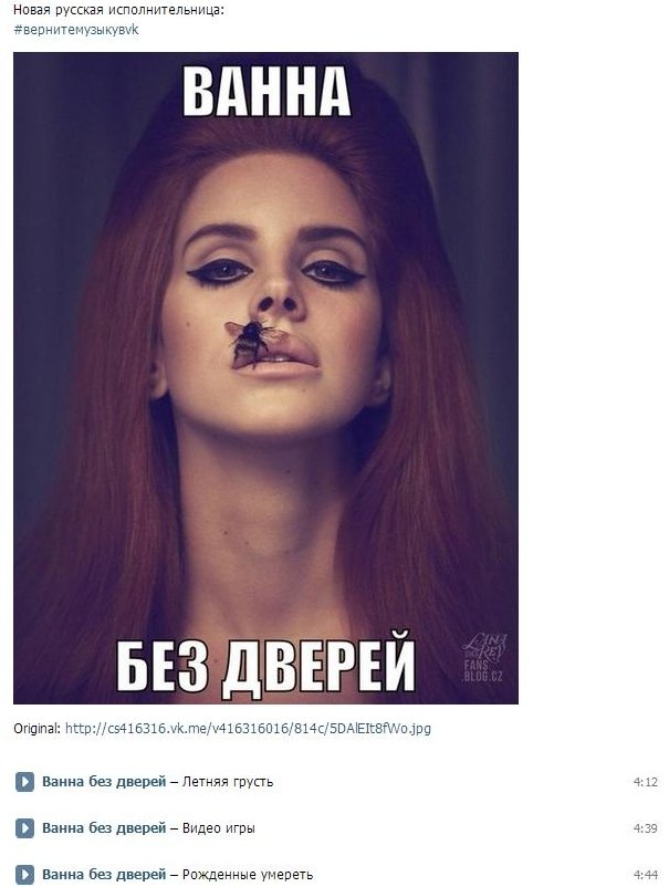 Багато хто сприйняв видалення музики з ВКонтакте як акцію уряду РФ щодо заборони зарубіжної музики. Таким чином у ВК тепер можна знайти виконавців «Ванна без Дверей» (Lana del Rey), 30 пельменів з Марса (30 Seconds to Mars) та інших.