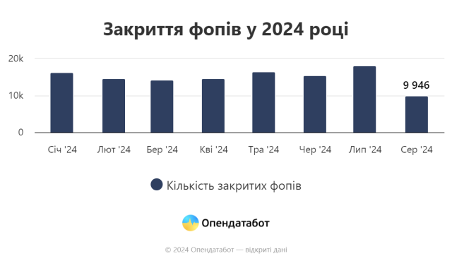 Наразі кількість нових справ в 1,6 раза більша, аніж закритих. Так, 120 154 фопи закрилось в Україні від початку року. Найбільше постраждали новостворені підприємства: з тих, що були відкриті торік, закрилося 24,5%, а з тих, що відкрилися цього року, — 13,7%. Медіана діяльності ФОПів, закритих цьогоріч, складає 2 роки і 7 місяців.Читати ще: В Україні зростає кількість боргів за аліментами: де найбільше