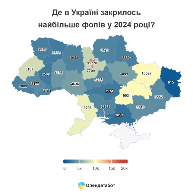 Найбільше фопів закрилось у Києві — 13% (15 770), Харківській — 8% (10 097) та Дніпропетровській — 8% (9 931) областях.Найбільше нових справ відкрили підприємці у столиці – 26 303 або 13,6% від загальної кількості нових ФОПів цьогоріч. Активно реєструють новий бізнес на Дніпропетровщині (18 025), Львівщині (14 459), Київщині (14 428) та Харківщині (12 954).Читати ще: У 9 справах з 10 українські суди скасовують штрафи від ТЦК