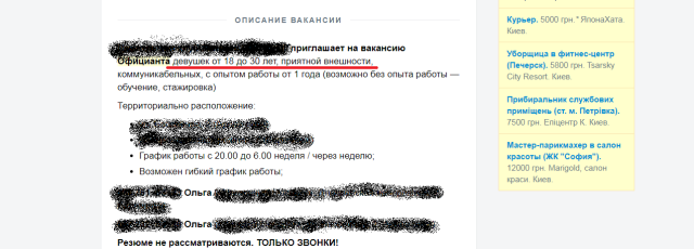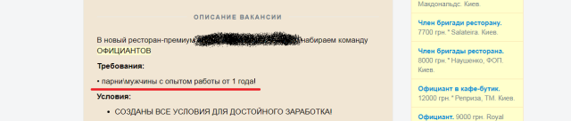 у функціональні обов’язки буде входити питання набору текстів, вміння готувати чай, каву – має бути досвід роботи. Не має бути зайвих вимог: якщо ми говоримо про офіціанта чи офіціантку – абсолютно без різниці, якого віку та зовнішності людина, якої довжини її ноги чи руки, це може бути як чоловік, так і жінка, адже робота полягає у знанні меню, ввічливому ставленні