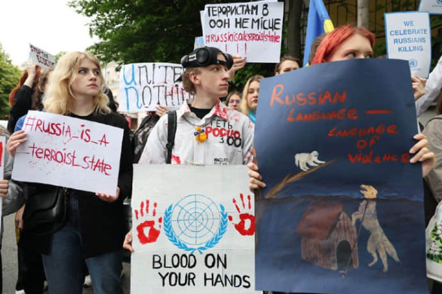Учасники акції скандують «Ганьба» і «Геть Росію з ООН». Вони також скинули російськомовні книжки біля входу до Офісу ООН.Люди тримають плакати з написами англійською та українською: «Росія − терористична держава», «ООН, кров на ваших руках», «Російська мова − мова насильства», «Зупиніть екоцид», «Терористам в ООН не місце», «Організація об’єднаних нікчем», «Мовчання − підтримка тероризму».Акція проходить мирно, жодних сутичок наразі немає, на місці присутні правоохоронці.