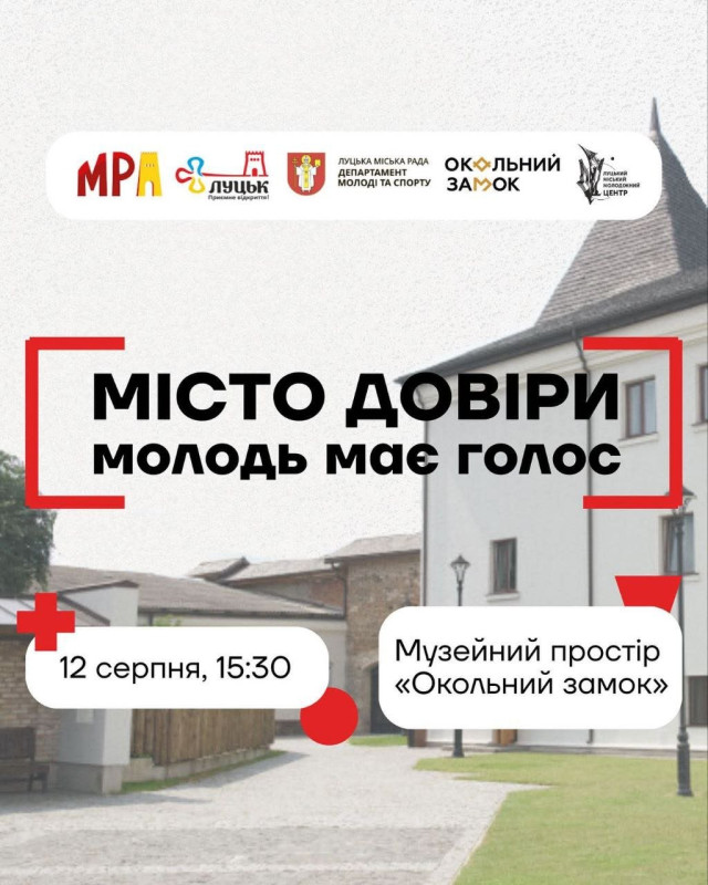 Volkanov у комплексі GOSTI | 7 серпняПрогулянка на болото. Реєстрація тут | 7 серпняТренування зі стречингу від ГО PRO WOMEN UA. Реєстрація тут | 7 серпняВоркшоп «Що робити на Кічкарівці?» на вул. Ковельській, 131 (Дім Пако) | 8 серпняFOODFEST 2025 на території Луцького національного технічного університету (вул. Львівська, 75) | 8-10 серпняБлагодійне тренування в Луцькому замку | 9 серпняВідкрита його-сесія на центральному пляжі в парку | 9 серпня«Парк ліхтарів» на території центрального парку імені Лесі Українки | до 10 серпняКонцерт «Реквієм у звуках» в костелі Святих Апостолів Петра і Павла | 10 серпняПрогулянка-екскурсія «Перетин». Реєстрація тут | 10 серпняЗустріч із молоддю в «Окольному замку» | 12 серпня«Як побудувати win-win стосунки з медіа». Лекція Ніни Богуш, PR Specialist MacPaw, у центрі Дія.Бізнес | 13 серпняВоркшоп з акторства в «Окольному замку» | 14-16 серпняCHEEV у комплексі GOSTI | 15 серпняПоетичний вечір в «Майстерні міста» | 15 серпня