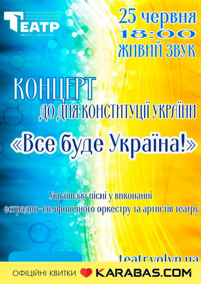 Вистава «На Івана Купала» у Волинському академічному обласному театрі ляльок | 24 червняВистава «Веселі пригоди на лісовій галявині» у Волинському академічному обласному театрі ляльок | 24 червняКонцерт до Дня Конституції України «Все буде Україна!» у Волинському академічному театрі імені Тараса Шевченка | 25 червняТранскордонний фестиваль «Етнокультура – сила, що єднає» в Палаці культури міста Луцька | 25 червняВистава «Маленький принц» у Волинському академічному обласному театрі ляльок | 25 червняЗірки Цирку дю Солей з шоу «Time» у Волинському академічному театрі імені Тараса Шевченка | 27 червняБазовий тренінг програми «Молодіжний працівник» у Волинському обласному молодіжному центрі YouthСфера | 27-29 червняКонцерт CHEEV у РЦ «Промінь» | 29 червняМузична комедія «Розлучення по-варшавськи» у Волинському академічному театрі імені Тараса Шевченка | 29 червняДрама на дві дії «Століття Якова: перше кохання (Поліська рапсодія)» у Волинському академічному театрі імені Тараса Шевченка | 30 червня