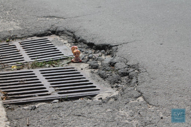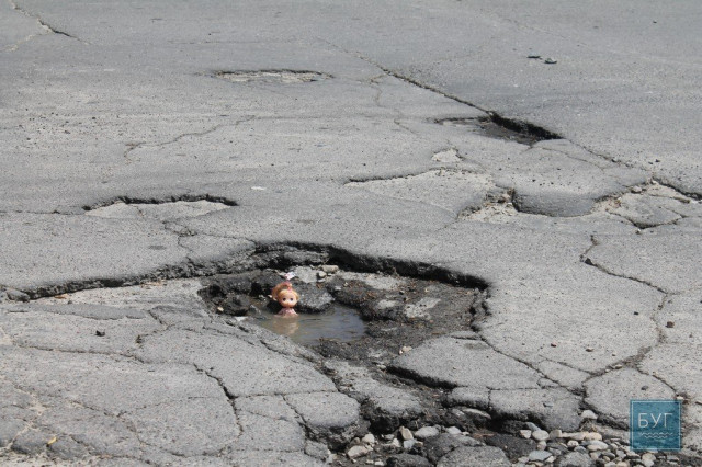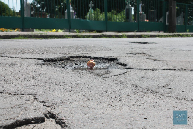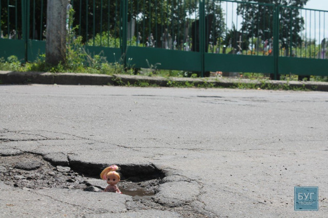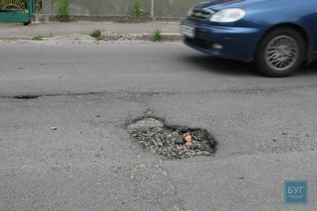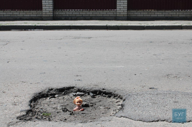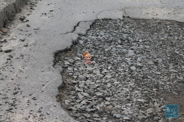 Нагадуємо, що “Інспектор Ляля” в сидячому положенні має зріст 6 сантиметрів, тому для є своєрідним мірилом, що візуально показує, які глибокі та небезпечні вибоїни на дорогах.