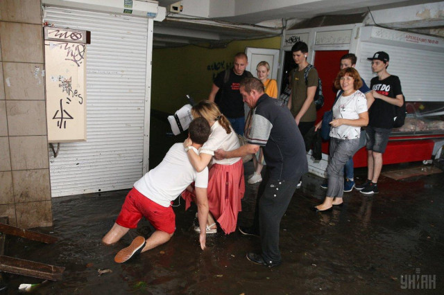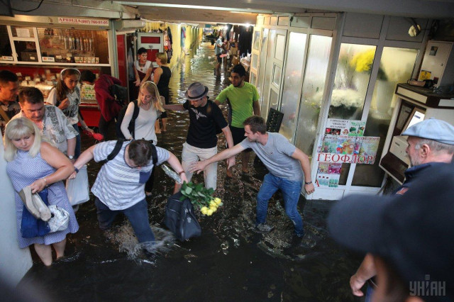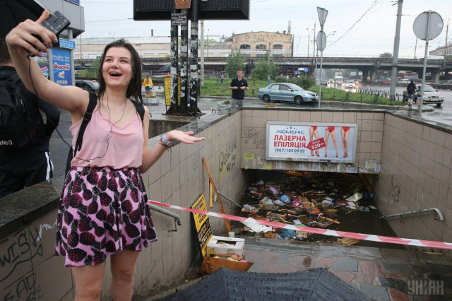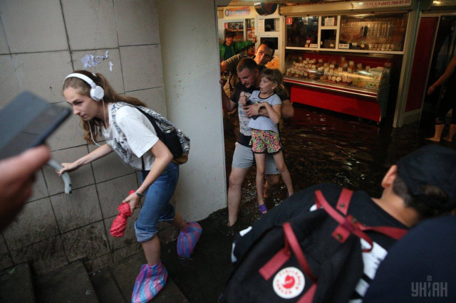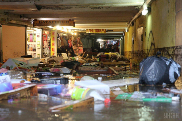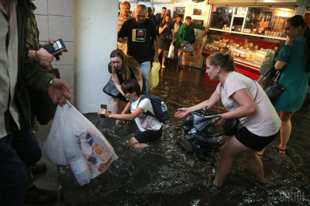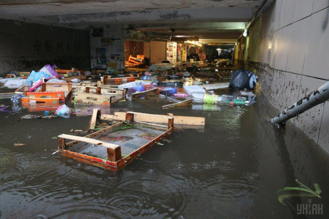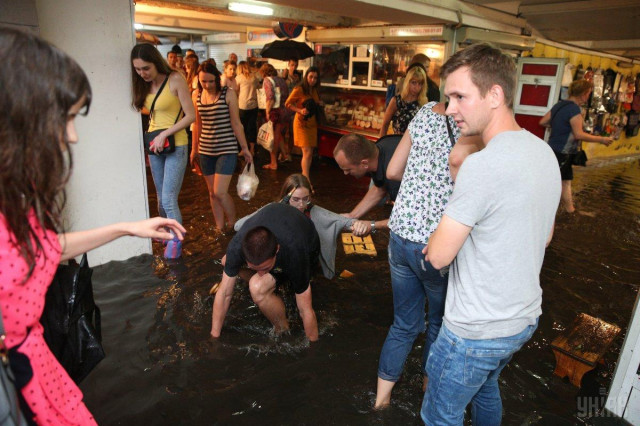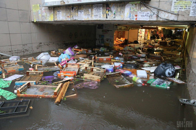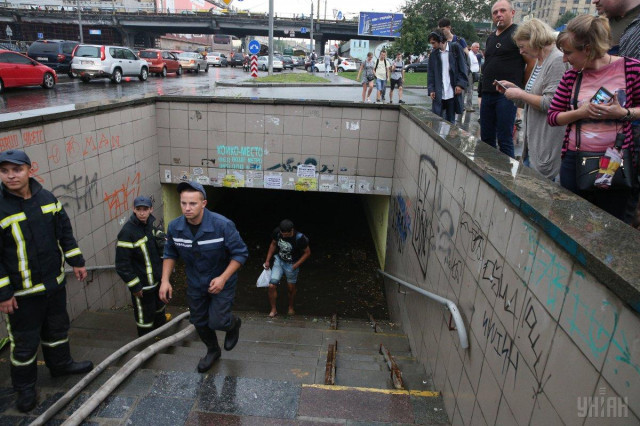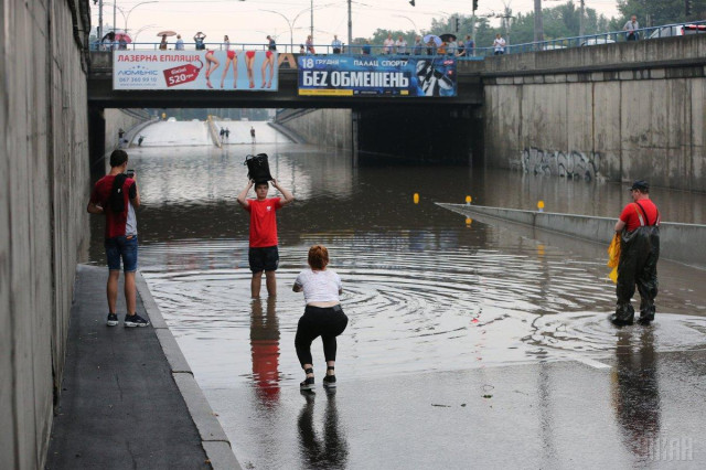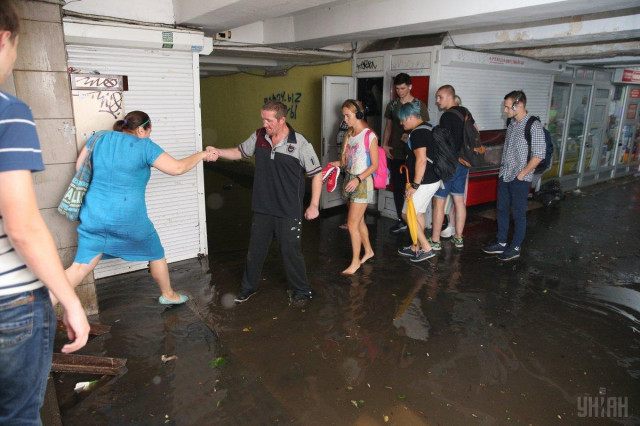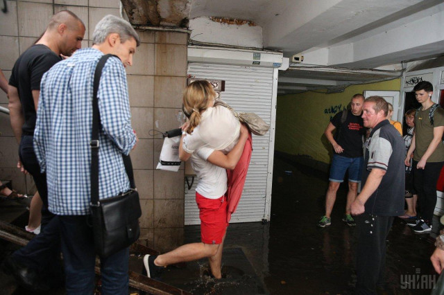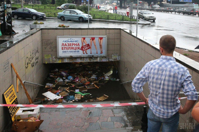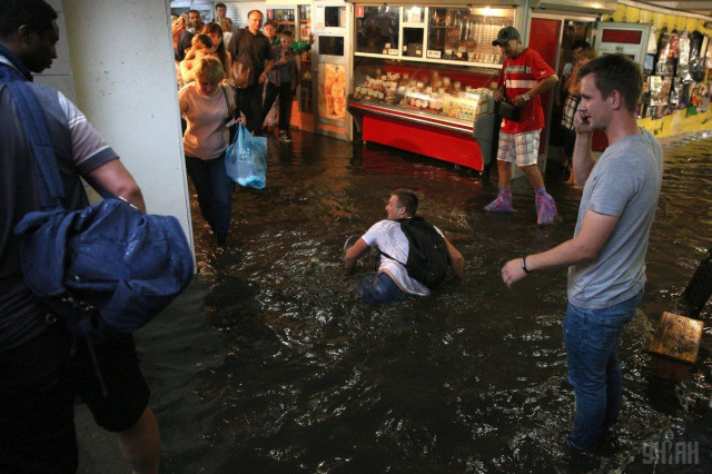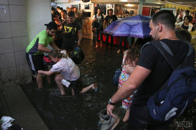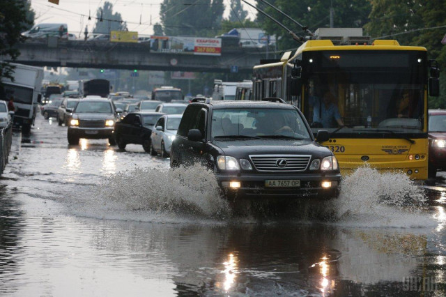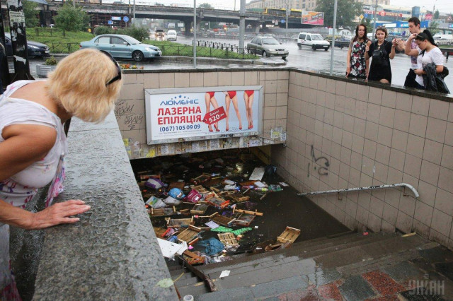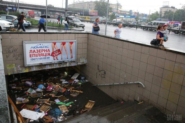 Затопило дороги і підземні переходи, в деяких утворилися навіть водоспади. Через зливи у Києві призупинили рух трамваїв і тролейбусів, повідомляє УНІАН.