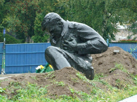 Наразі скульптура радянського воїна лежить осторонь постаменту на землі і дійсно має вигляд пораненого на полі бою.