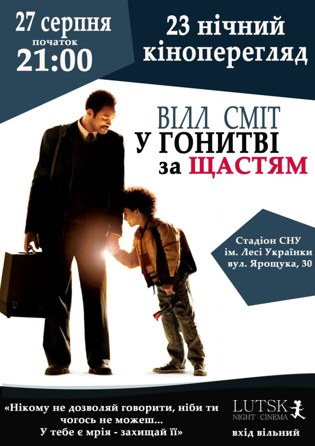 Лучан запрошують на черговий кінопоказ під відкритим небом, який відбудеться 27 серпня. У рамках проекту «Lutsk night cinema» глядачам покажуть кінострічку режисера Томаса Яна «У гонитві за щастям».