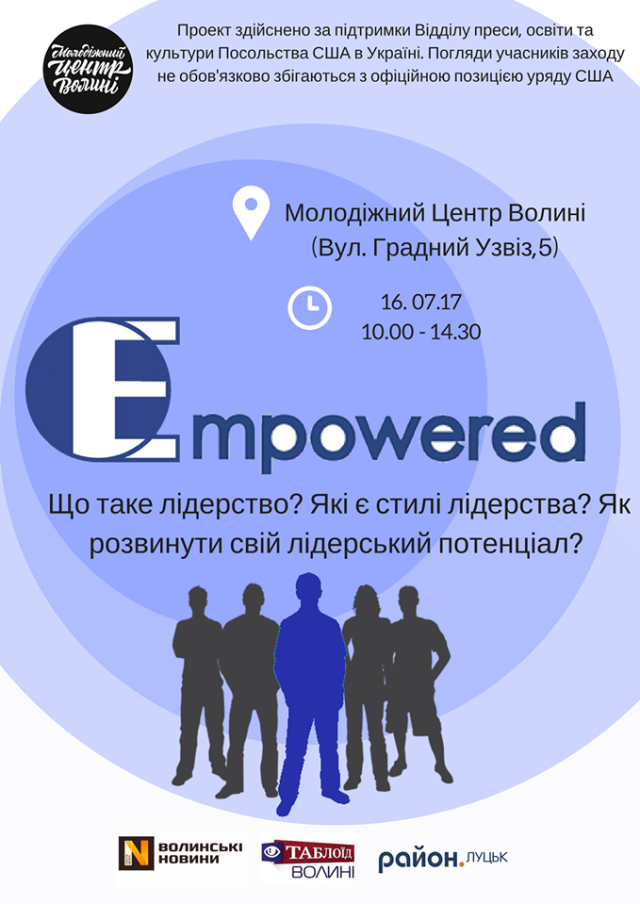 У неділю, 16 липня, у рамках проекту «Empowered» відбудеться перший тренінг для майбутніх лідерів. Захід проходитиме з 10:00 до 14:30 у приміщенні Молодіжного Центру Волині (вул. Градний Узвіз 5).