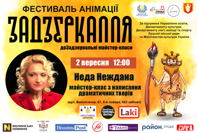 У суботу, 2 вересня, о 12:00 у приміщенні «Креативної лабораторії», що на вулиці Винниченка (вул. Винниченка, 67, 6-й поверх, 602 кабінет) відбудеться зустріч з київським драматургом, поетом та культурологом Недою Нежданою. Захід організовують у рамках дофестивальних майстер-класів фестивалю анімації «Задзеркалля».