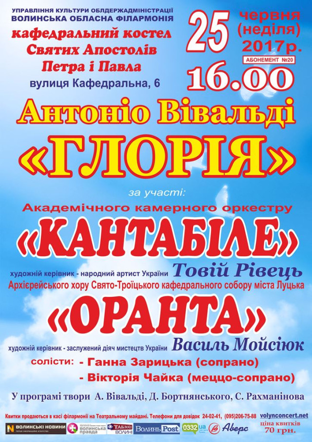 25 червня о 16.00 у Кафедральному костелі святих апостолiв Петра i Павла відбудеться концерт духовної музики - Антоніо Вівальді «ГЛОРІЯ».