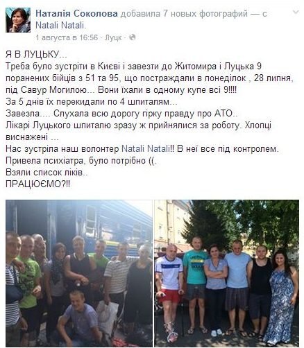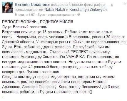 Волонтери, зокрема Наталія Соколова, яка опікувалася уже не одним волинським військовим та пораненими волинянами на Майдані, розпочали збір медикаментів, яких може забракнути медичній установі через великий наплив пацієнтів.