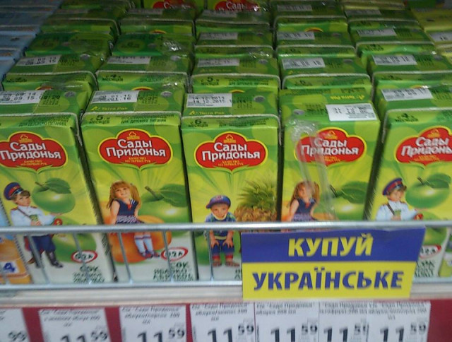 В одному з супермаркетів Луцька на продаж виставлені соки російського виробника під табличкою«Купуй українське».
