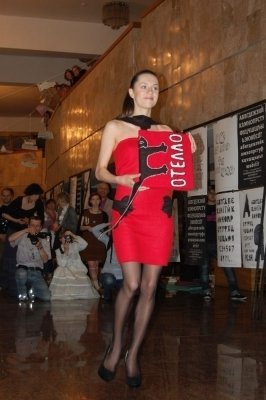 Модельєр Олександр Васильєв поєднав власну сукню з твором Стендаля «Червоне та чорне», створивши цілий образ дівчини-книги з велетенським червоним ірокезом та довгим чорним платтям.