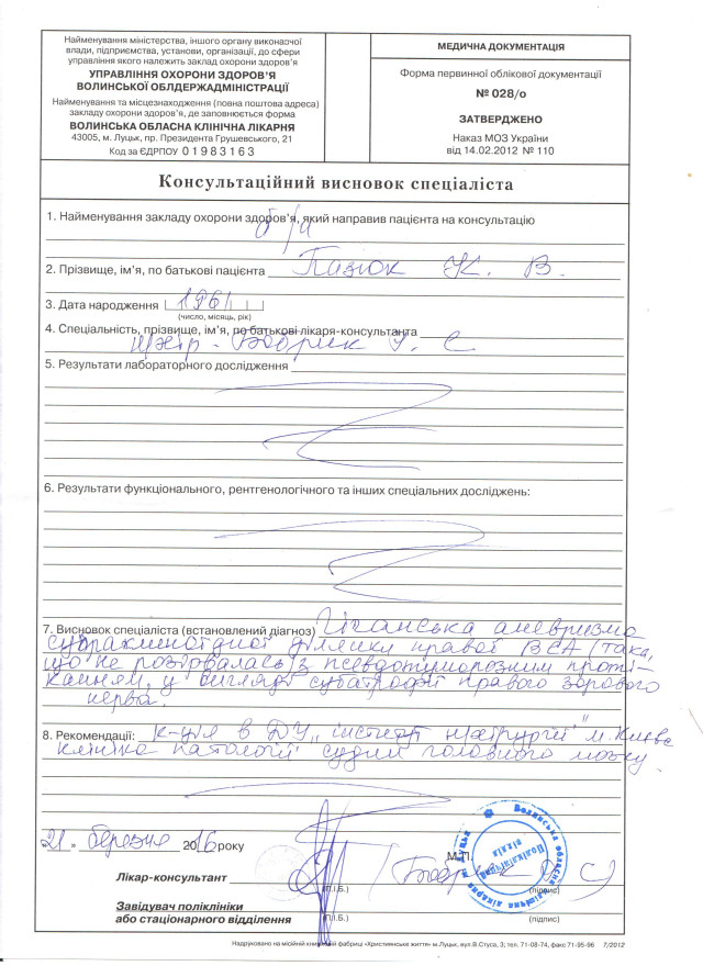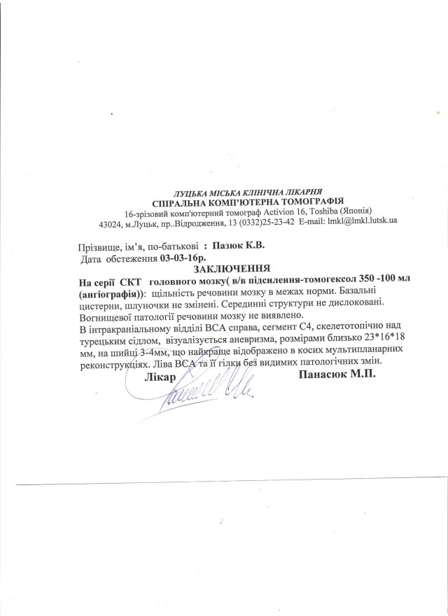 Лікарі поставили діагноз: гіганська аневризма супраклиноїдної ділянки правої ВСА (така, що не розірвалася з псевдотуморозним протіканням у вигляді субатофії правого зорового нерва.