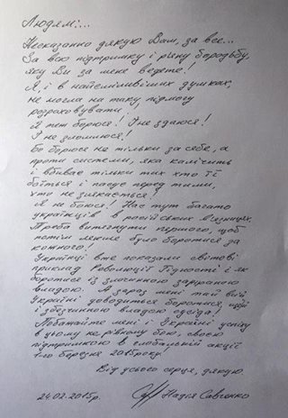 "Побажайте мені й Україні успіху у цьому нерівному бою своєю підтримкою в глобальній акції 1 березня 2015 року", – написала вона.Окрім того, авіаторка закликала українців не здаватися і вірити у перемогу.