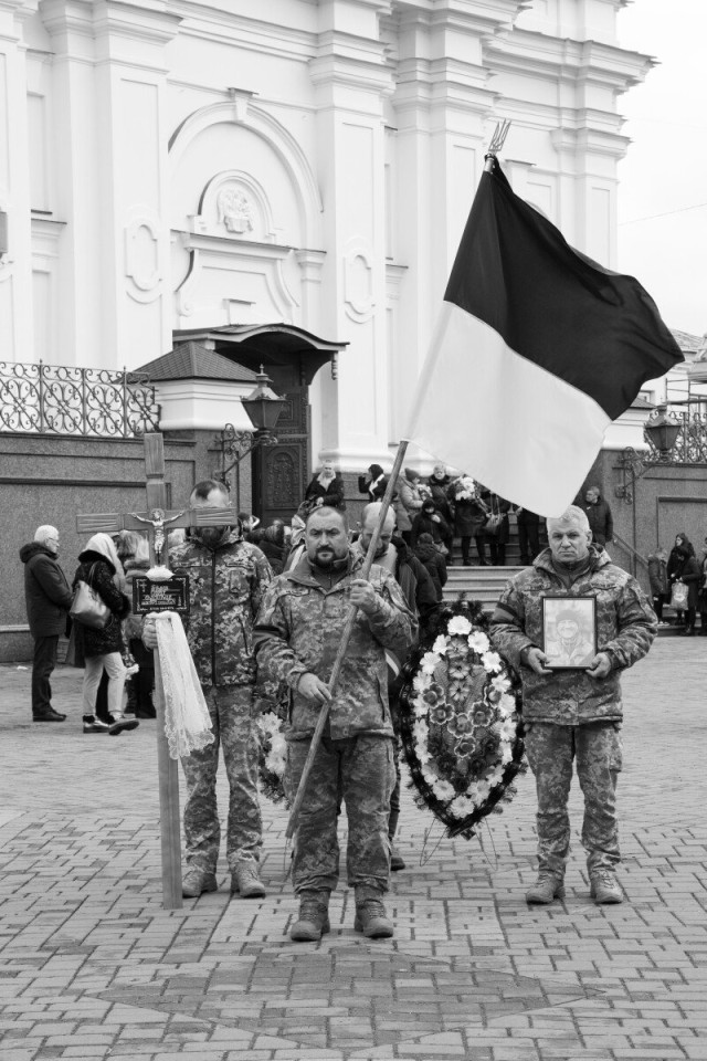 Після завершення богослужіння домовину з тілом загиблого захисника пронесли Театральним майданом. Біля пам’ятного фотостенду «Герої Небесної Сотні – Загинули за єдність України» траурна процесія зупинилася і виконала Державний Гімн.