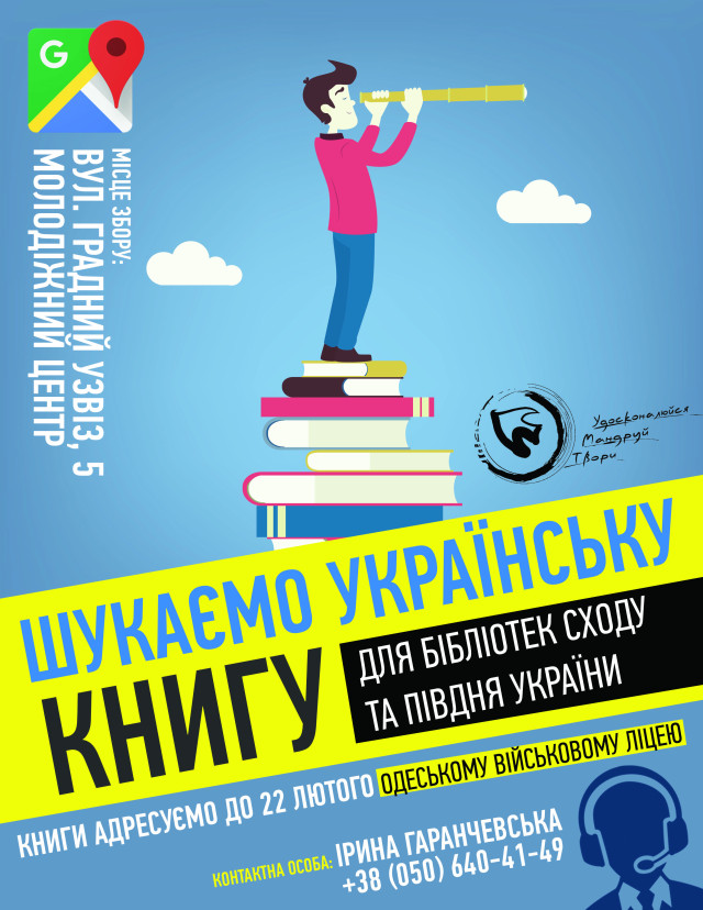 Тож, вона закликає усіх охочих принести україномовну літературу на морську, історичну, військову, патріотичну тематику. Місце збору - Молодіжний центр (Градний узвіз, 5). Деталі за тел.: (050) 650 41 49 - Ірина.