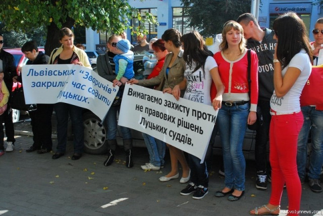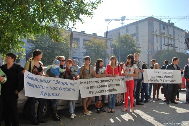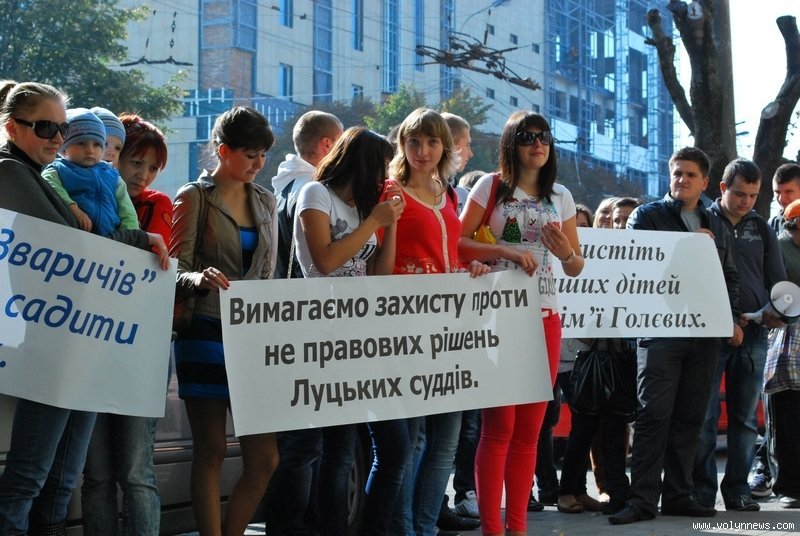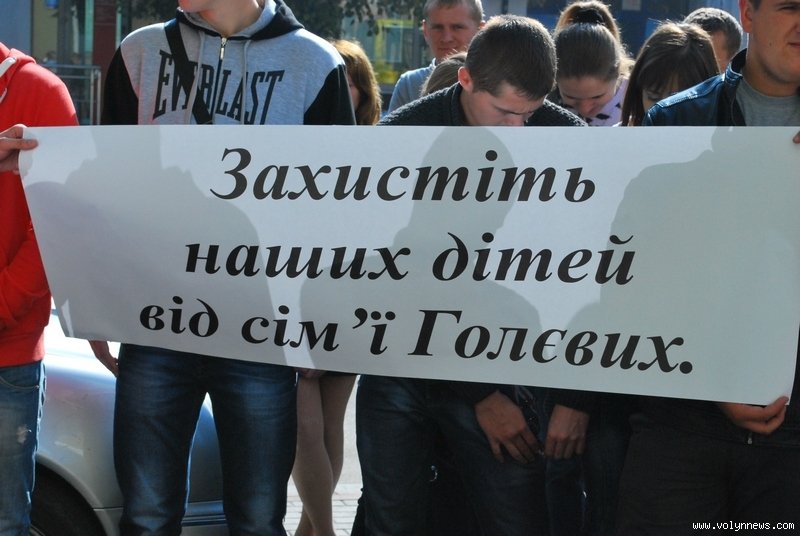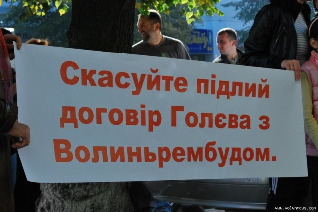 Тож, під правоохоронним відомством мешканці гуртожитку розгорнули плакати з надписами: «Захистіть наших дітей від Голєвих», «Вимагаємо захисту проти неправових рішень луцьких суддів», «Скасуйте підлий договір Голєва з Волиньрембудом».