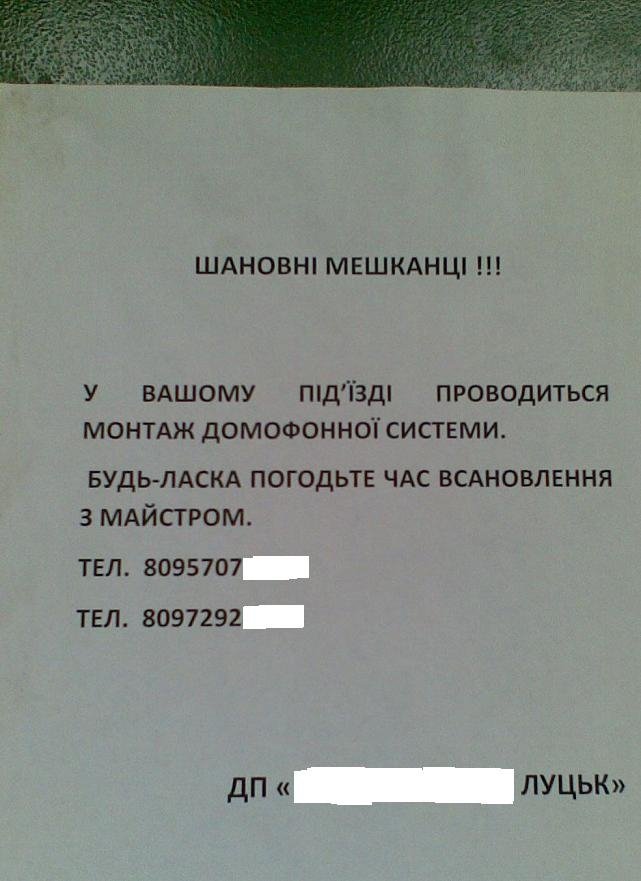 Мешканці будинку на вулиці Кравчука в обласному центрі поскаржилися міському голові Богдану Шибі, що фірма встановила домофон на дверях під’їзду без їхньої згоди. Про це йшлося під час особистого прийому громадян, – повідомляють «Волинські Новини».