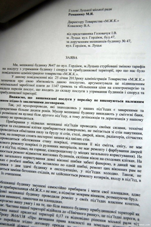 Зважаючи на стан багатоповерхівки, мешканці проти збільшення вартості послуги з утримання будинку та прибудинкової території. Від деяких з них вони вирішили взагалі відмовитися. «25 січня на нашому будинку по всіх під’їздах були розклеєні повідомлення товариством «М.Ж.К.» про те, що тарифи на комунальні послуги будуть змінюватись у бік збільшення. Ми порахували, що це 2 гривні 26 копійок за 1 квадратний метр, раніше ми платили по 1 гривні 70 копійок, приблизно. Мешканці будинку стурбовані цим зараз. Ми зібрали ініціативну групу, на 29 число призначили загальні збори на сьому вечора. Прийшли люди зі всіх під’їздів (власники квартир), це все ми оформили протоколом. Є списки мешканців, які були присутні на зборах. Ми обговорювали зміни тарифів на послуги, оцінку якості виконання послуг. Затвердили тексти заяви та зібрали підписи. І вирішили змінити договір. Тобто розірвати попередній та скласти новий на вигідних нам умовах. Ми замовили тільки ті послуги, які вважаємо, що необхідні» - розповіла Інна Головачук.