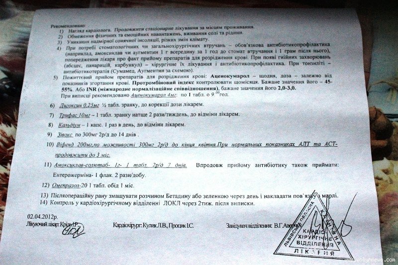Чоловік приймає препарат німецького виробництва «Віфенд», що має допомогти йому подолати хворобу через яку йому, власне, двічі замінювали штучний серцевий клапан. «Це протигрибковий препарат останнього покоління. В нас в лікарні немає таких медикаментів» - зауважила завідувач відділення.